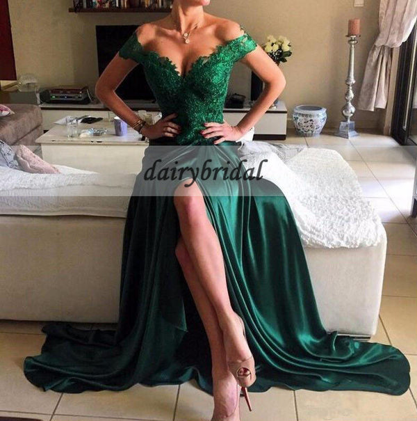 Off Shoulder Lace Prom Dress, Sexy Slit Satin Green Prom Dress,D405