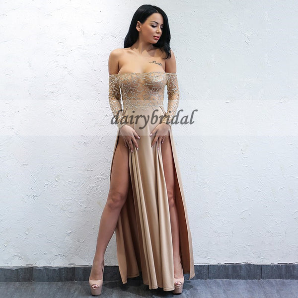 Sexy Slit Lace Prom Dress, Off shoulder Long sleeve Soft Satin Prom Dress, D346