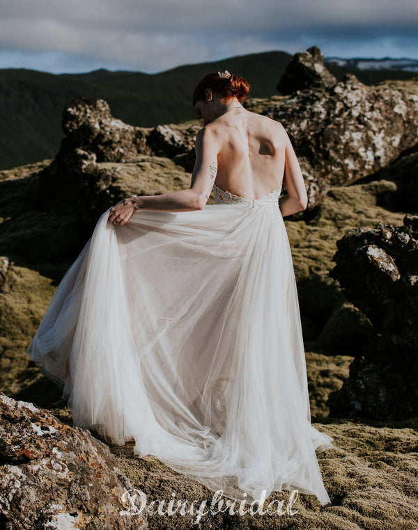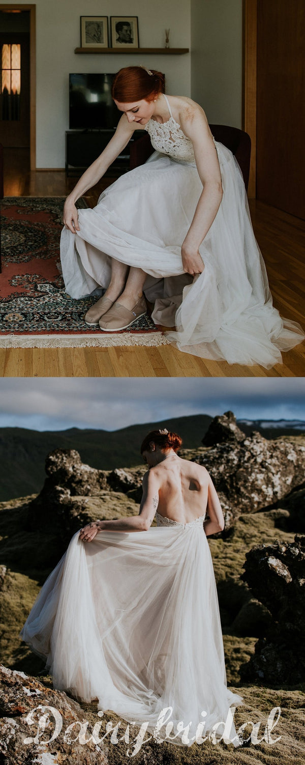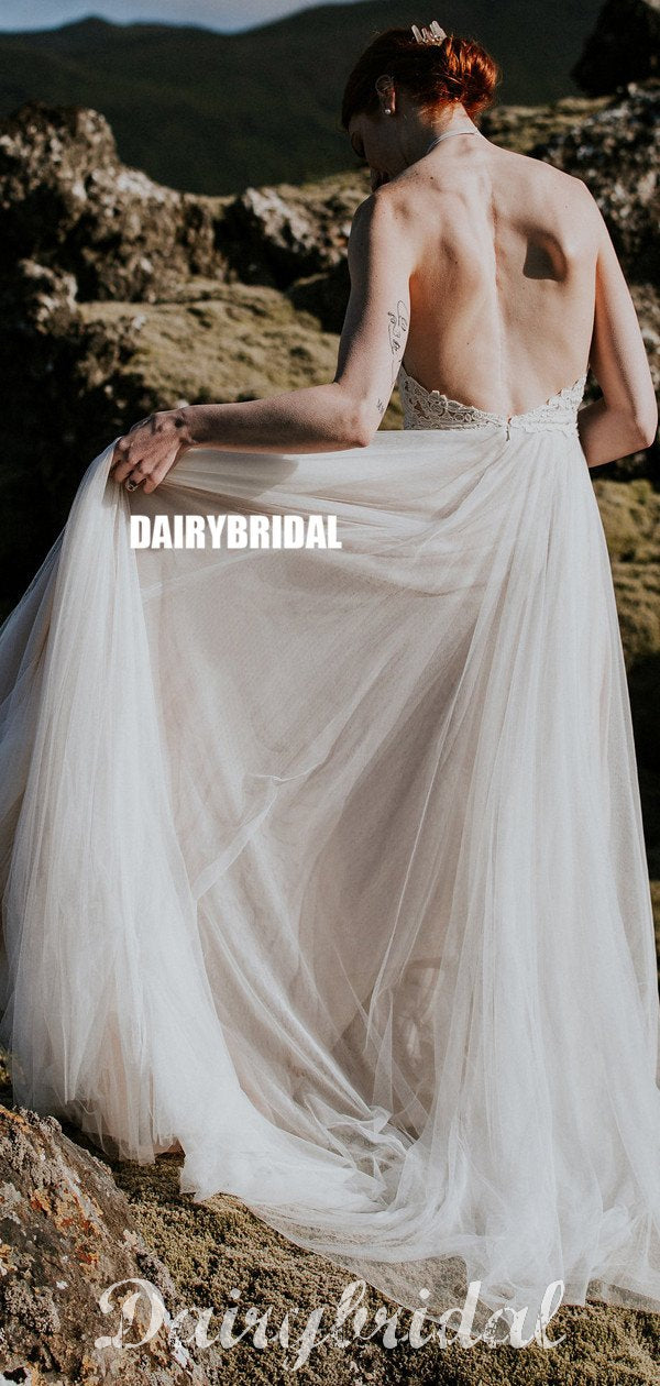 Halter Lace Top A-Line Backless Tulle Cheap Beach Wedding Dress, FC1647