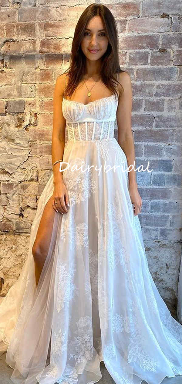 Elegant Spaghetti Straps Lace Backless Slit Wedding Dresses, FC5867 Elegant Spaghetti Straps Lace Backless Slit Wedding Dresses, FC5867