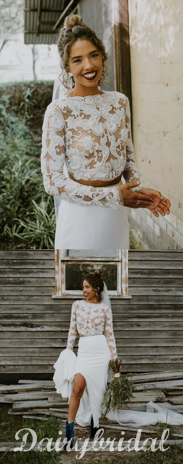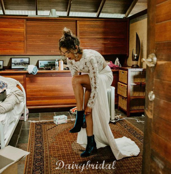 Unique Two Pieces Chiffon Sexy Slit Long Sleeve Lace Wedding Dresses, FC1659 Unique Two Pieces Chiffon Sexy Slit Long Sleeve Lace Wedding Dresses, FC1659