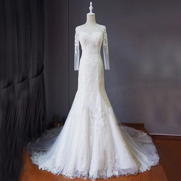 Long Wedding Dress, Applique Wedding Dress, Tulle Bridal Dress, Long Sleeve Wedding Dress, Lace Wedding Dress, Wedding Dress with Train, Backless Wedding Dress, LB0390