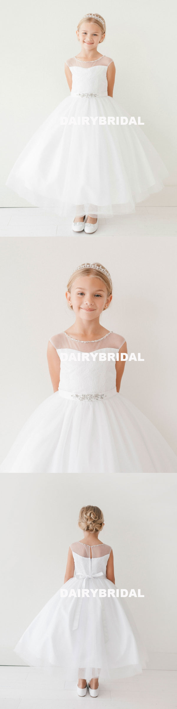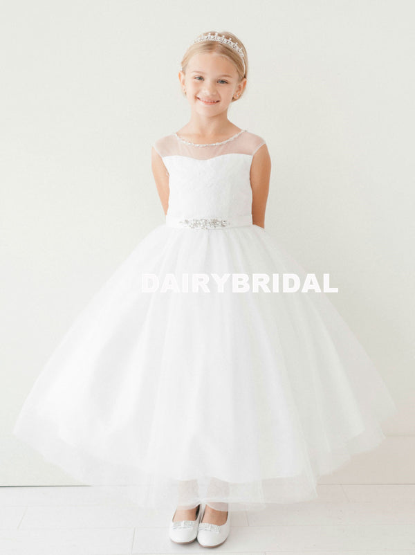 Lace Top Tulle Flower Girl Dresses, Popular Little Girl Dresses with Beaded Belt, D1147