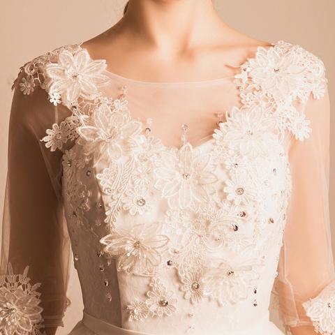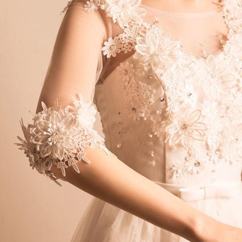 1, Material: lace, tulle, applique, beads, elastic silk like stain.