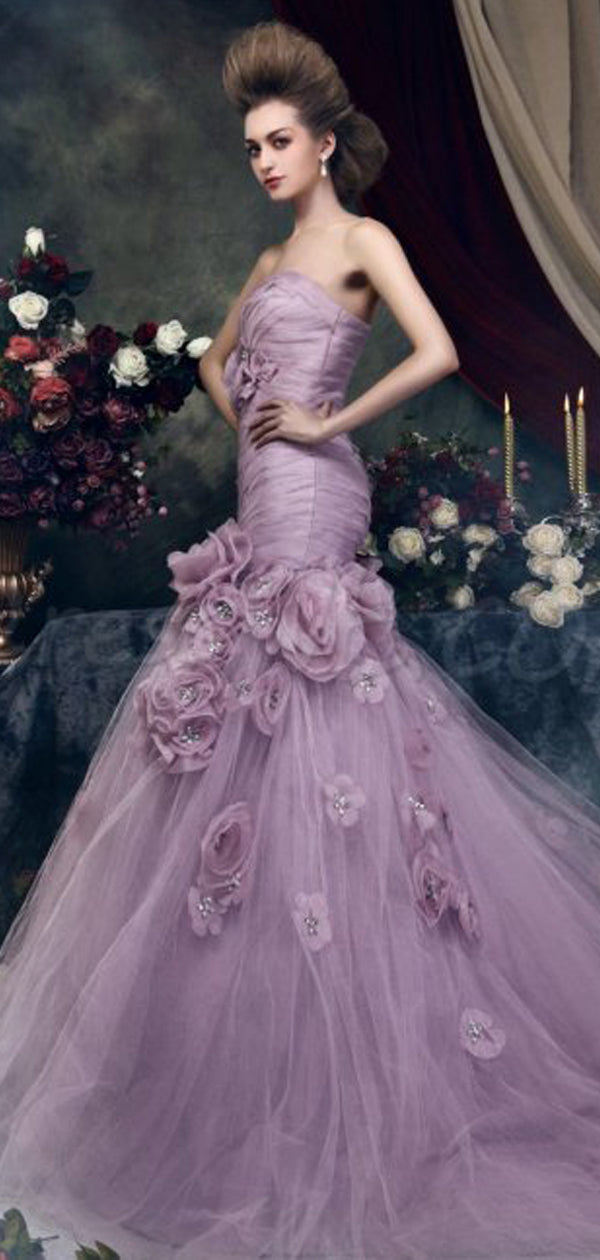 Gorgeous Strapless Mermaid Light Purple Tulle Appliques Wedding Dresses, WD0176
