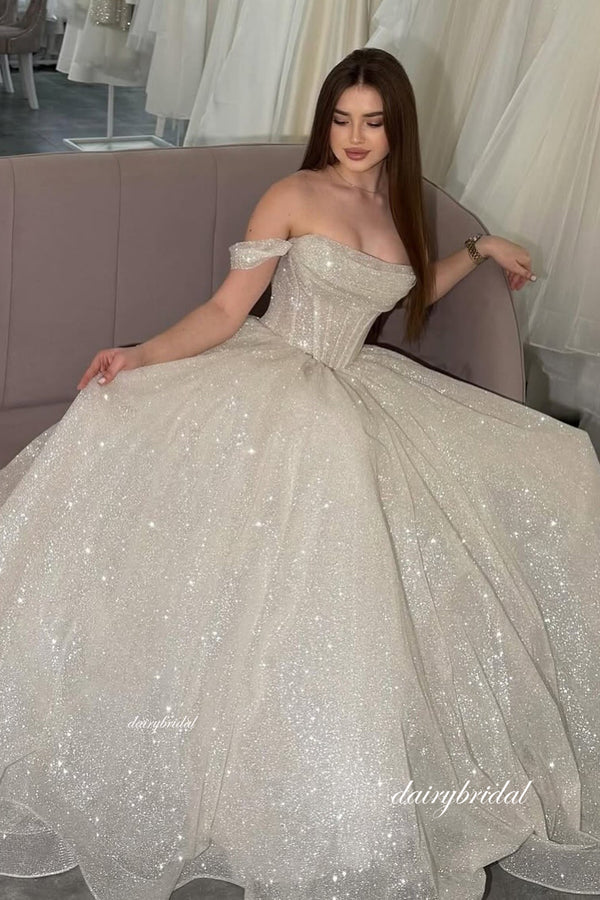 New Sparkle A-line Off Shoulder White Backless Prom Dresses, DB107